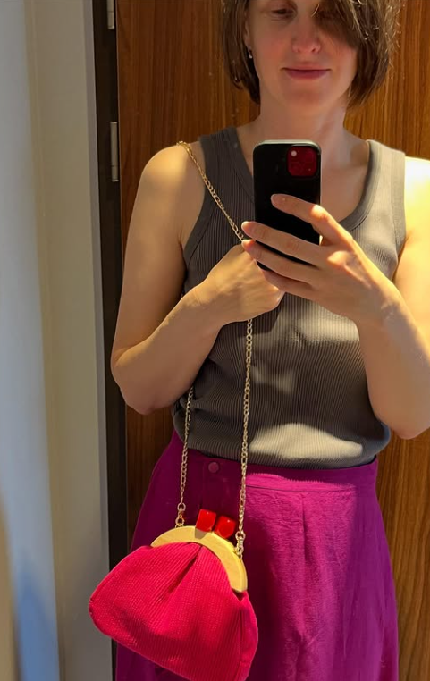 Сумочка виглядає дуже стильною, сучасною та водночас грайливою завдяки яскравим кольорам і незвичайному поєднанню матеріалів.